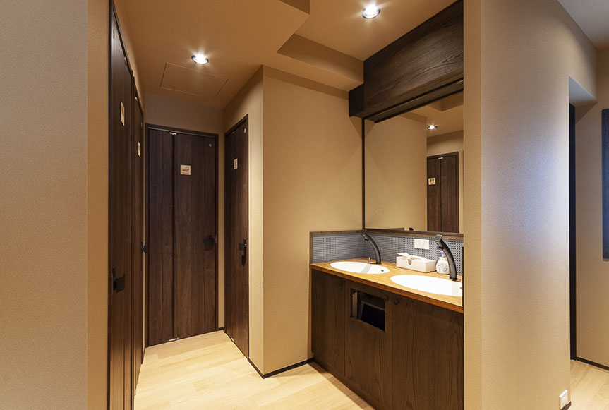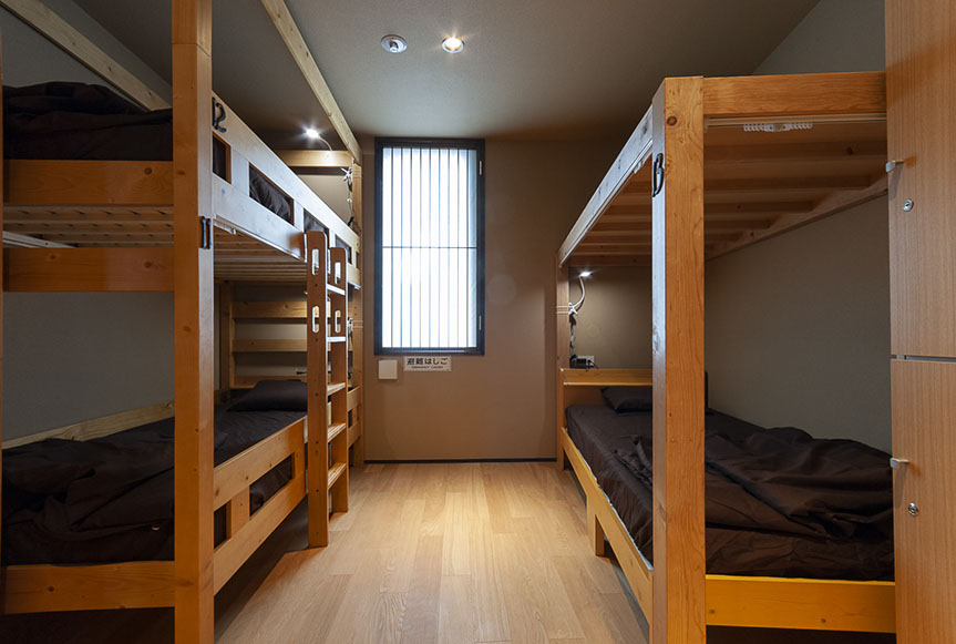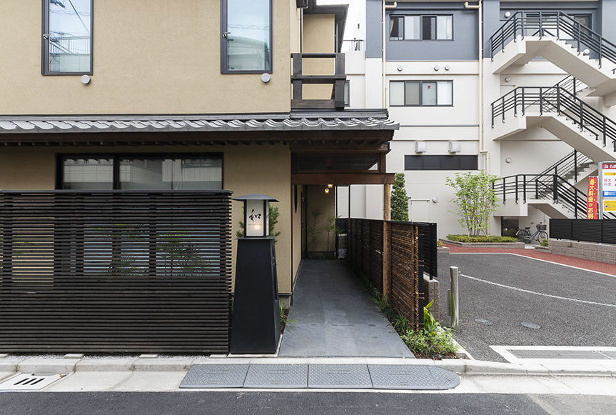 江戸時代の文人達が好んで住んだ根岸。この歴史ある街に位置するこのゲストハウスは、主に外国人観光客を対象として計画されました。はるばる日本へ訪れる観光客を迎えるのは本格的な一文字葺き瓦で葺いた庇の掛かる門。黒竹の竹垣を配した路地を通り、エントランスへアプローチします。1階は寛ぎスペースとしました。一部は畳敷の座敷とし、障子の嵌る開口部からは主庭を眺める事ができます。2階3階は宿泊室は主に2段ベットを主に配置しています。主庭はコケを中心とした構成とし、和風の庭にしています。行燈の様なデザインのスチールで製作された看板は、インターホンとポスト機能を一体として設計しました。