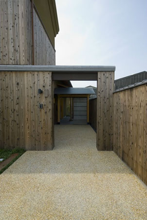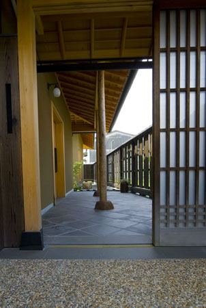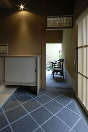 アプローチは、車椅子で出入りしやすいように緩やかなスロープとし、土間の材料はすべりにくいものにしました。また、門を2つ製作し、さらに門の奥に細長い庭を作り、道路からの距離を取る事で家に落ち着きをもたらしました。