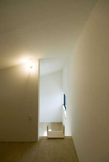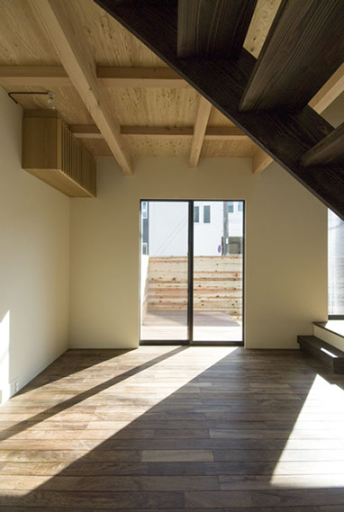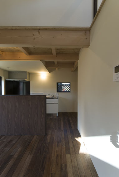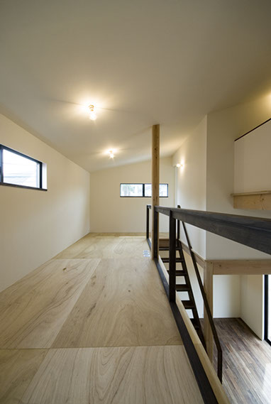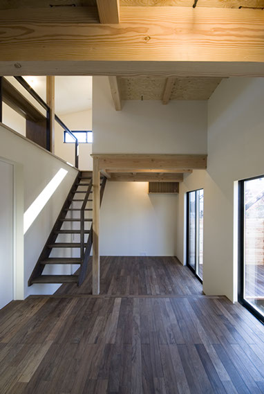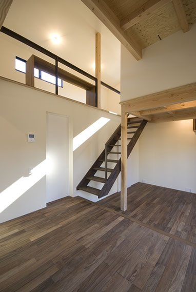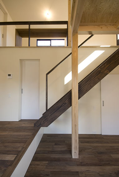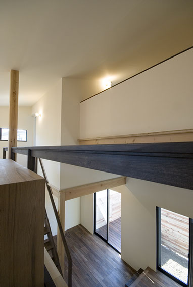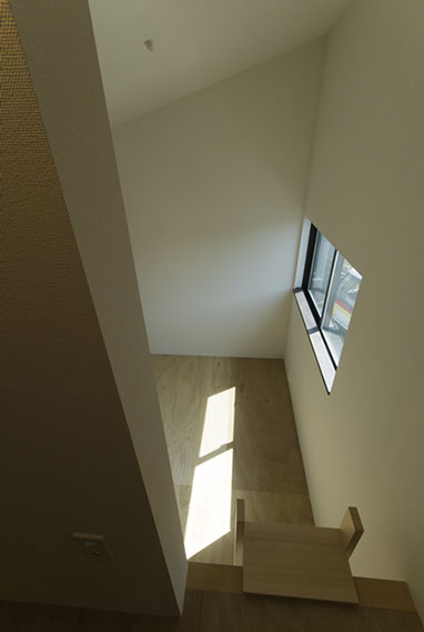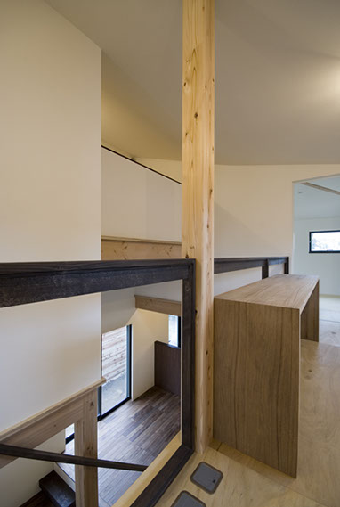 建主は、家族がだんらん出来る家で、それぞれの気配が感じられる家を望んでいました。この要望を満たすために、家の中心に大きな吹抜を計画しました。この吹抜の周りに各部屋を配置し、さらに、スキップフロアにして、お互いの部屋をゆるくつなげました。その結果、どの部屋にいても吹抜から家族の気配を感じる事ができます。