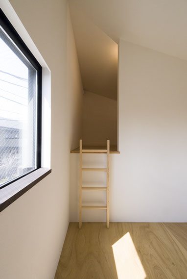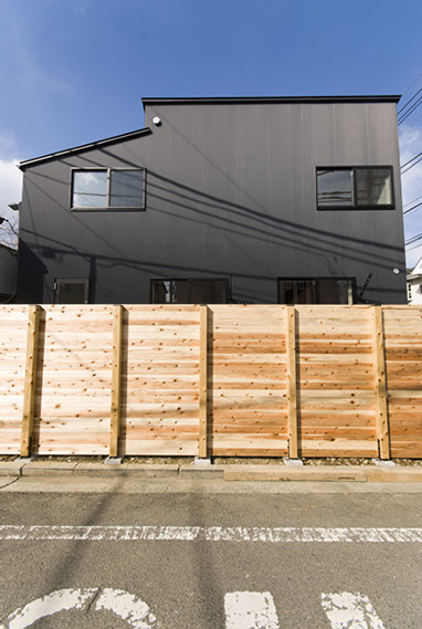1階の空間は床にアジアンウォールナット、壁は塗装を使って引き締まった空間にしています。それに対して2階はシナベニヤの床とビニールクロスの壁の簡素な仕上げです。なんでもなんでも見境なく安いものを使用するのではなく、理想を追求したうえでの予算配分を行っています。外壁は、ガルバリウム鋼板の波板を貼りました。波板の外壁は、他の既製品の外壁に比べてもかなり安く仕上がりますが、屋根に使用する材料の為、耐久性が抜群です。
