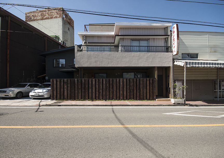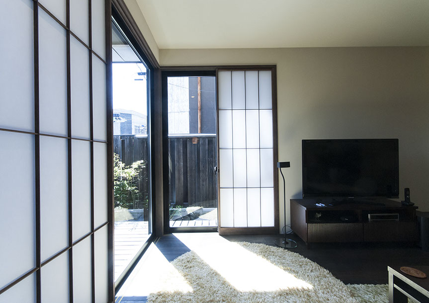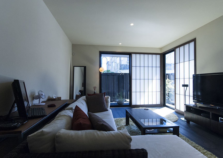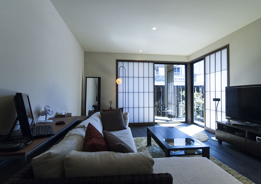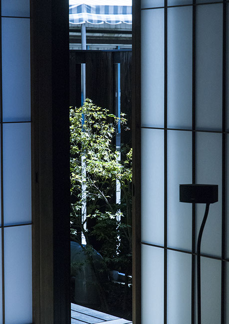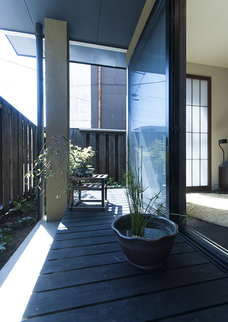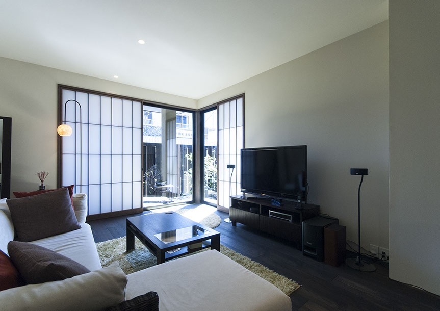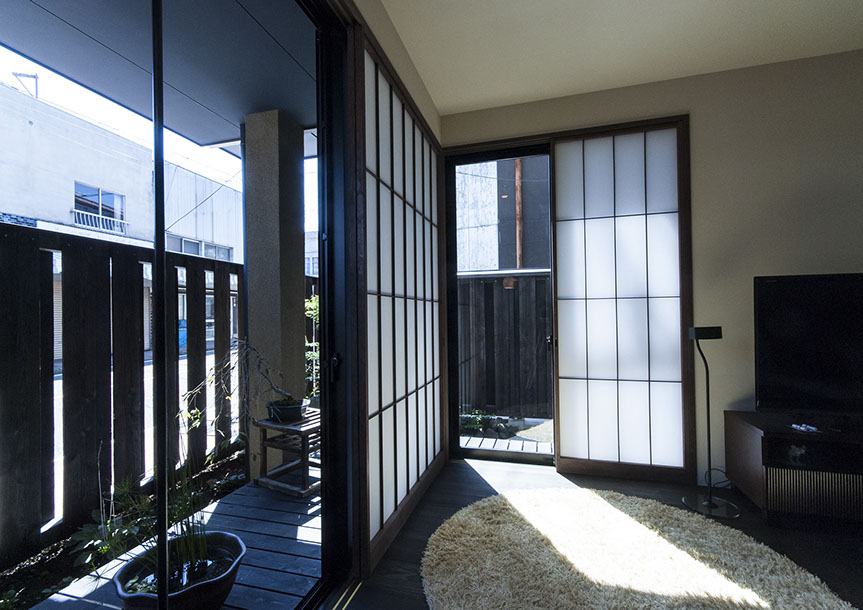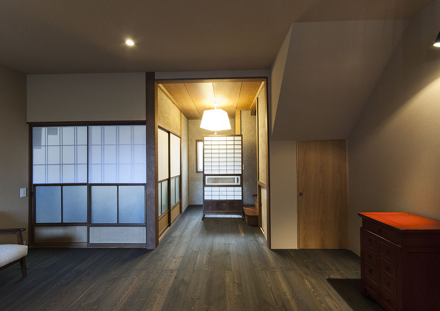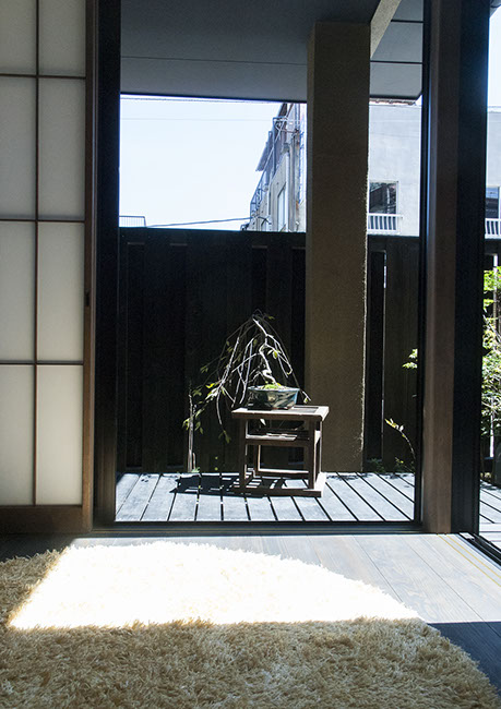 既存建物の店舗部分は道に向けて大きく開放的に面していた。その一方住居部分は、店舗の奥部分にあり、眺望もなく、スペースも限られていた。そこで、店舗部分にメインの部屋を配置することにするが、今度はあまりにも道に開放的であったため、その間に庭を配置し、お互いに程よくつながる様にした。基本的なプランは2世帯がゆるやかに繋がる間取りとしたが、お互いの空間の雰囲気を変えて設計し、それぞれの世帯に個性を持たせた。