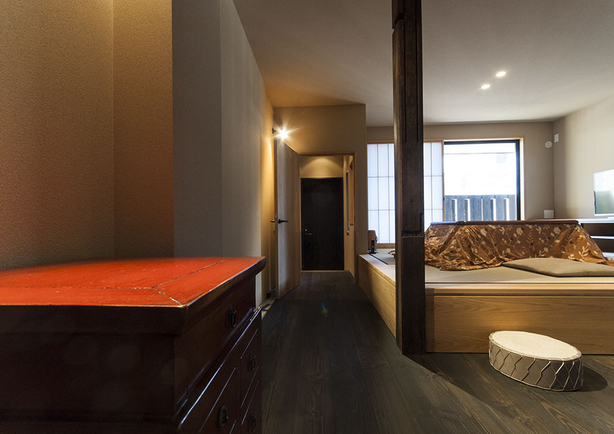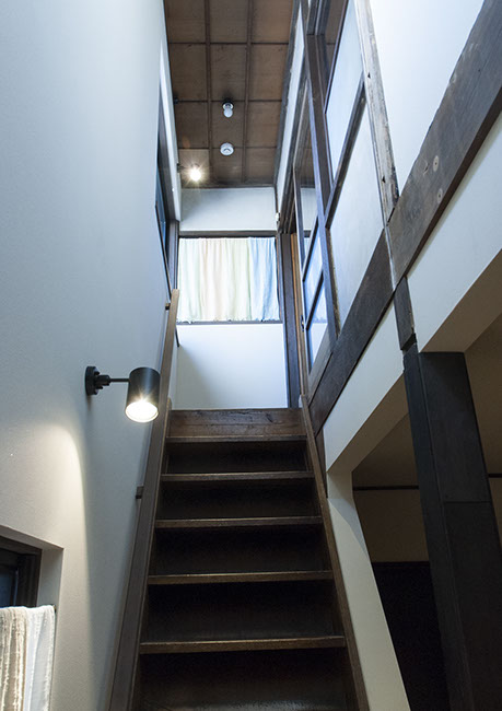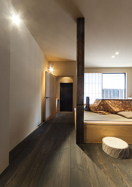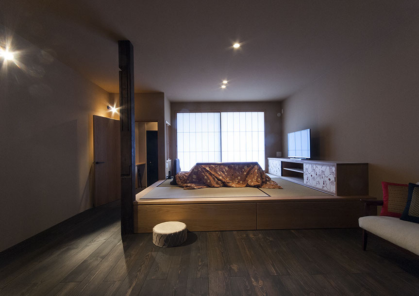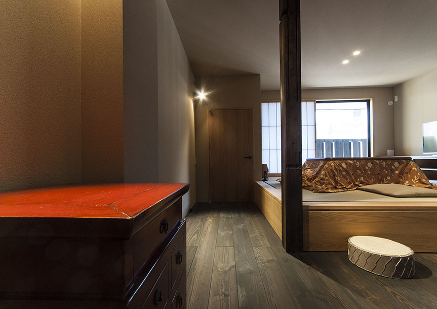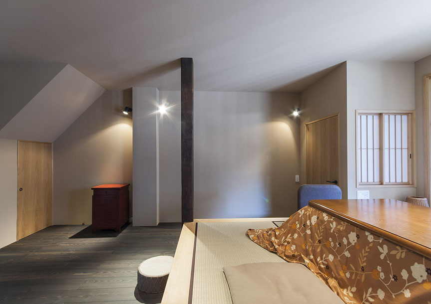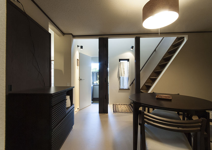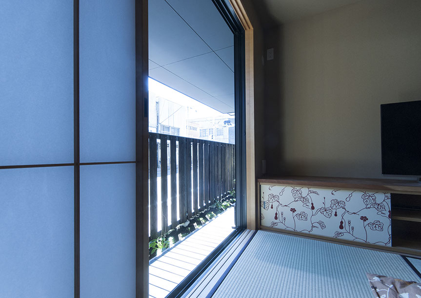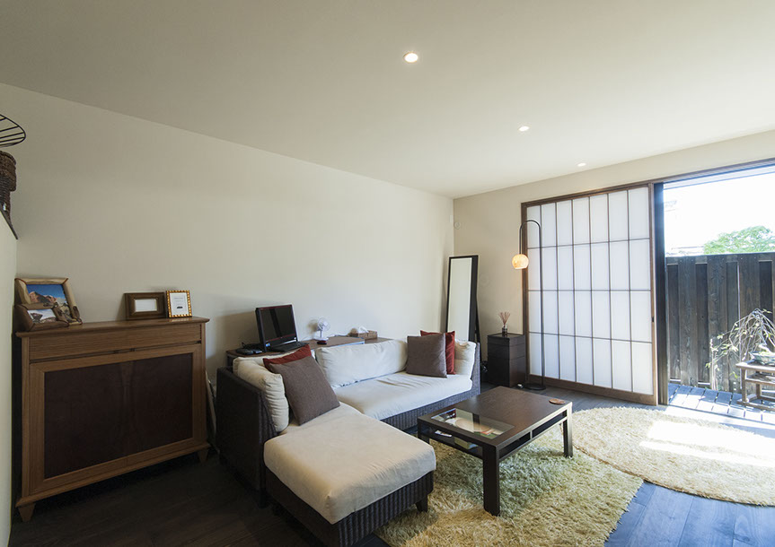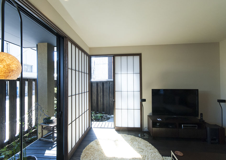 既存建物の店舗部分は道に向けて大きく開放的に面していた。その一方住居部分は、店舗の奥部分にあり、眺望もなく、スペースも限られていた。そこで、店舗部分にメインの部屋を配置することにするが、今度はあまりにも道に開放的であったため、その間に庭を配置し、お互いに程よくつながる様にした。基本的なプランは2世帯がゆるやかに繋がる間取りとしたが、お互いの空間の雰囲気を変えて設計し、それぞれの世帯に個性を持たせた。