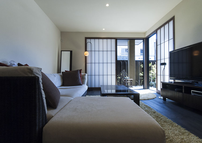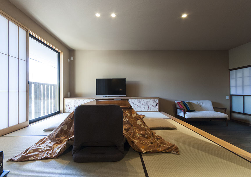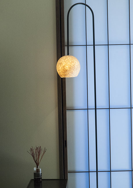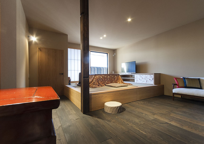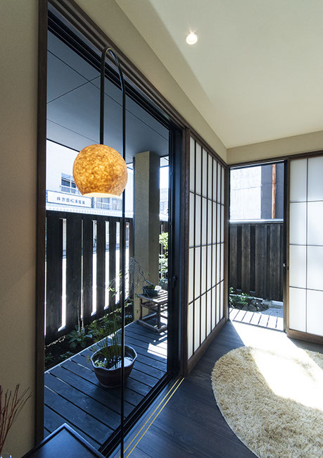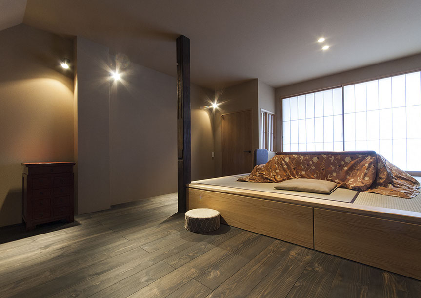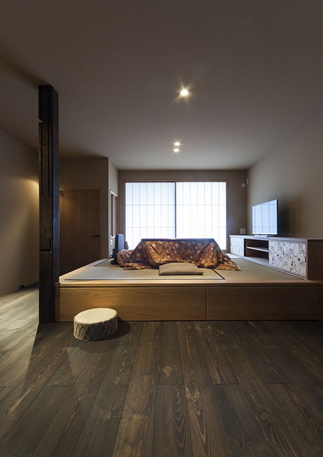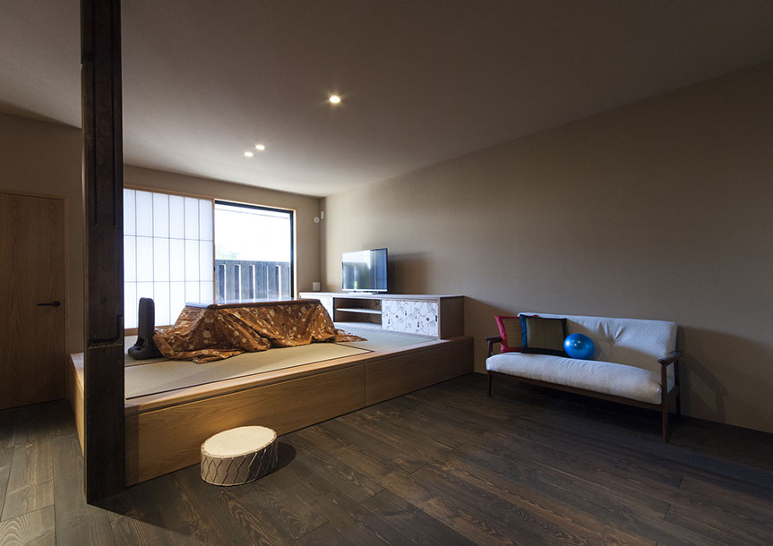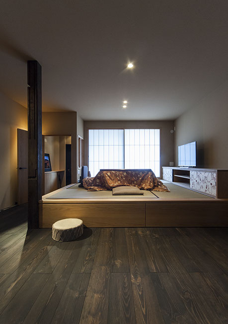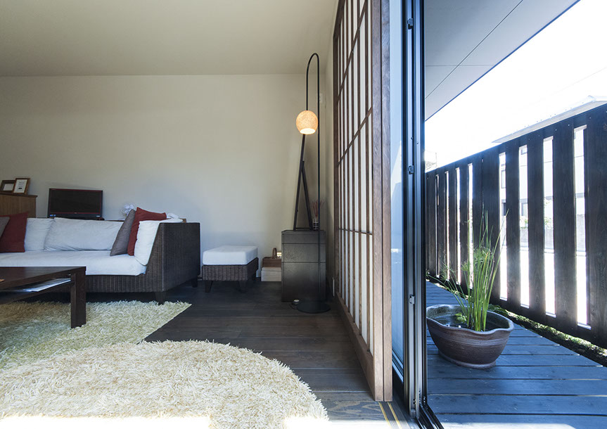 既存建物の店舗部分は道に向けて大きく開放的に面していた。その一方住居部分は、店舗の奥部分にあり、眺望もなく、スペースも限られていた。そこで、店舗部分にメインの部屋を配置することにするが、今度はあまりにも道に開放的であったため、その間に庭を配置し、お互いに程よくつながる様にした。基本的なプランは2世帯がゆるやかに繋がる間取りとしたが、お互いの空間の雰囲気を変えて設計し、それぞれの世帯に個性を持たせた。