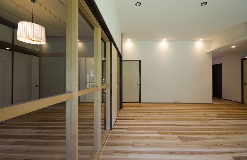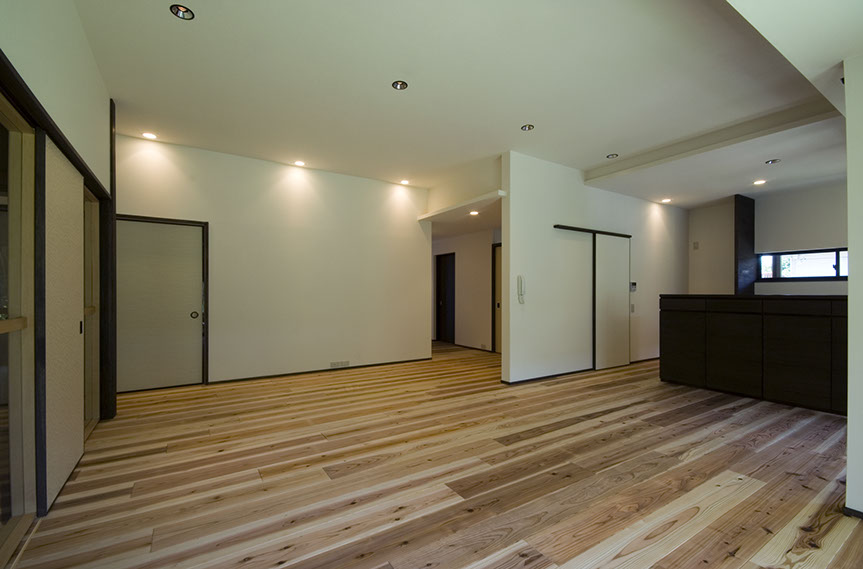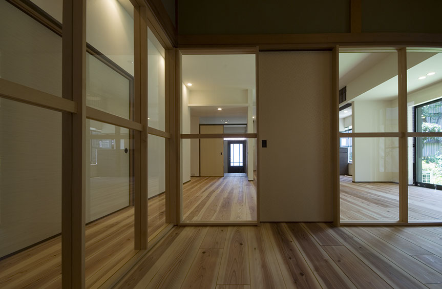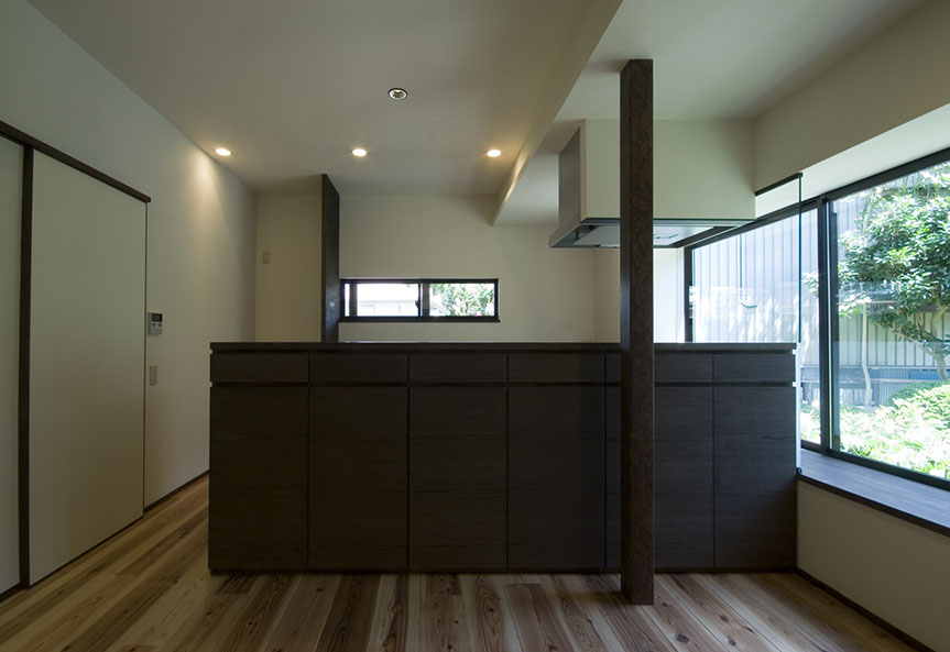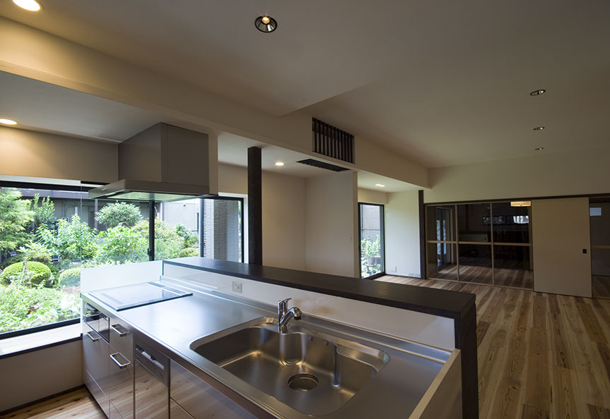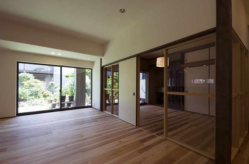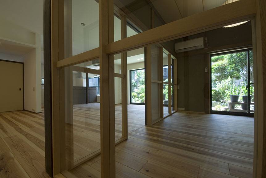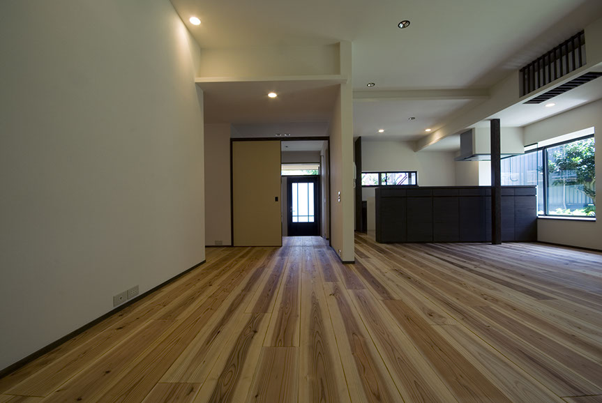 まず、リビングと洗面所などとの部屋の温度差を無くし、また車椅子の生活になった場合にも使いやすいように水廻りを含めたワンルームとしました。孤立していたキッチンは、リビングの中に、洗面脱衣室もリビングの中に、今までのような廊下は無くなり、全てが部屋になりました。南側には庭師でもある住人が、手入れをしている庭があり、眺めがとてもよかったので、部屋の中からも積極的に見せています。床には、厚み3センチの山口県産の杉材のフローリングを全面的に使いました。杉材は、やらかいので暖かく肌触りが非常に良く心地が良い木材です。玄関のアプローチから庭へ向かう通路が狭かったので、通路を広げる為、減築も行いました。(減築とは、増築の反対で、建物を削って小さくする事です。)
