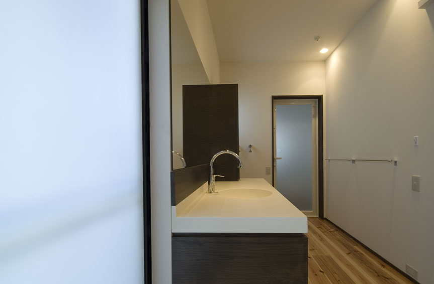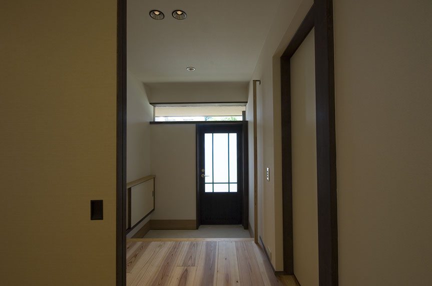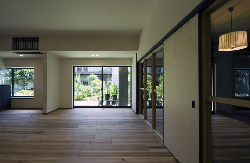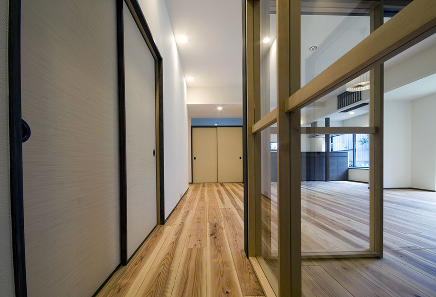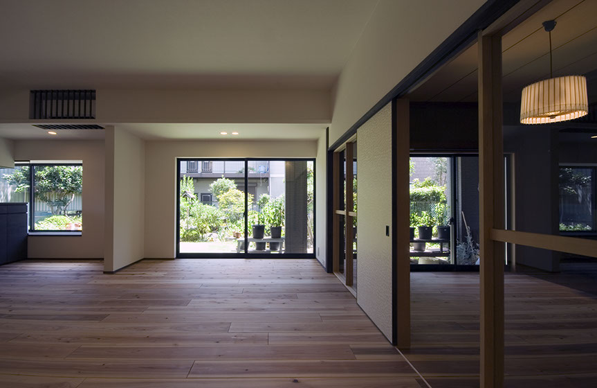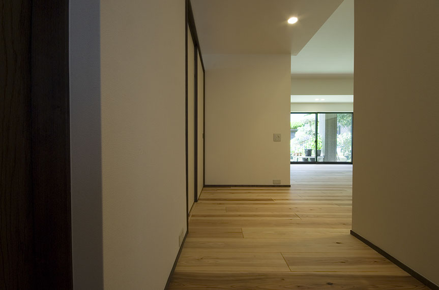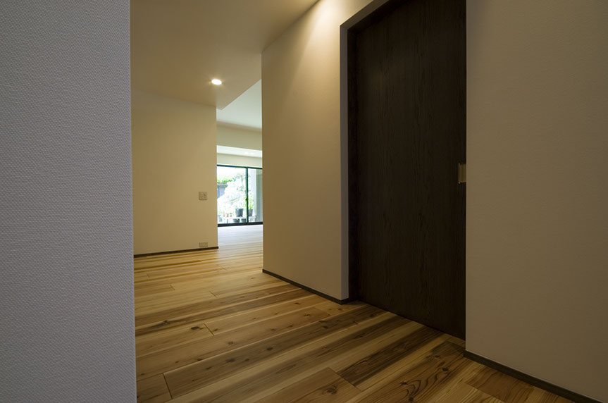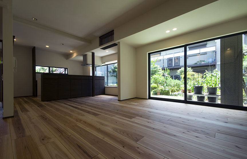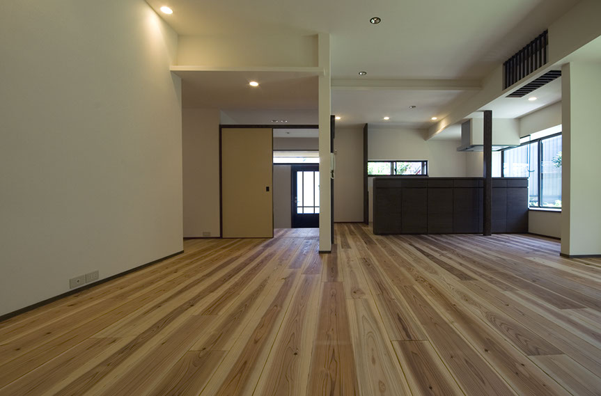 まず、リビングと洗面所などとの部屋の温度差を無くし、また車椅子の生活になった場合にも使いやすいように水廻りを含めたワンルームとしました。孤立していたキッチンは、リビングの中に、洗面脱衣室もリビングの中に、今までのような廊下は無くなり、全てが部屋になりました。南側には庭師でもある住人が、手入れをしている庭があり、眺めがとてもよかったので、部屋の中からも積極的に見せています。床には、厚み3センチの山口県産の杉材のフローリングを全面的に使いました。杉材は、やらかいので暖かく肌触りが非常に良く心地が良い木材です。玄関のアプローチから庭へ向かう通路が狭かったので、通路を広げる為、減築も行いました。(減築とは、増築の反対で、建物を削って小さくする事です。)