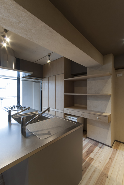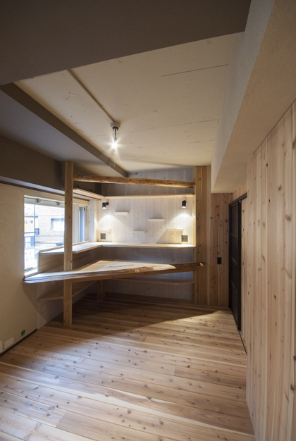 プランとしては、小部屋を多く作らず、2つの大きな部屋を中心として構成しました。家族の集まるリビングダイニングはキッチンとワンルームとし、一部にはバルコニーを作りました。一方、寝室は、子供部屋兼用とし、 部屋の一部に小さな子供達の為の、子供スペースを作りました。レベルの上がった床に座り、お絵かきをしたり、台によじ登ってジャングルジムになったり、また、上の丸太にロープを掛けてブランコしたりと、子供たちの豊かな創造力が色々な遊びを生み出します。
