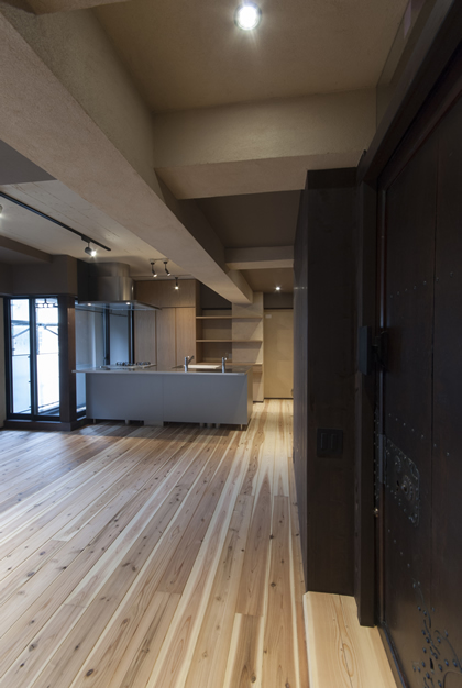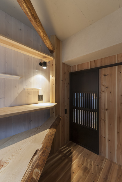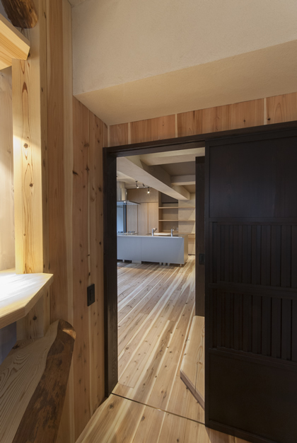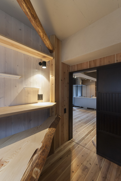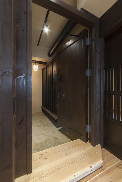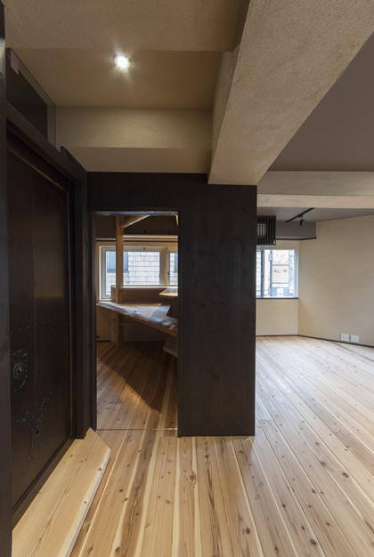 玄関扉は大正時代の古い蔵戸。厚みは6センチもあります。重厚なこの蔵戸を開けるとそこには木の空間が広がります。今回は、床と壁の一部に島根県の杉材を使用しました。杉は柔らかく、手触りがソフトでやさしい材料です。壁には左官職人によるオリジナルの塗り壁を塗っています。
