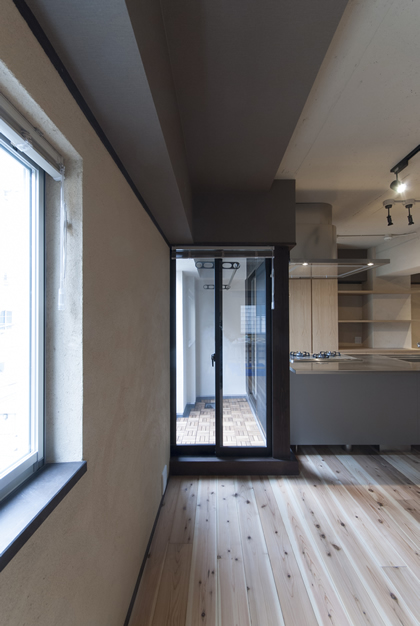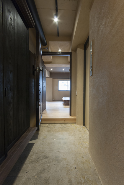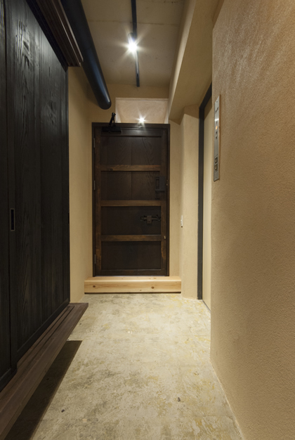 今回改装するスペースは、鉄筋コンクリート造5階建てのビルの3階部分です。その為、メインのアプローチはエレベーターを使用します。3階に到着し、扉が開くと土間が出迎えます。建物に入ってから、一度外の空間を表現する事により、アプローチに深みが増し、訪問者にインパクトを与えます。