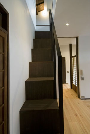 リビングの主庭に面した窓には、以前縁側に使用されていた障子を再利用しました。ロフトスペースに上がる為の階段は、伝統的な箱階段にしました。箱階段の収納は、リビング廻りの雑物が収納しやすいように細かく分かれています。