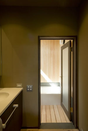 裏庭に面した浴室は、ユニットバスにはせずに、在来工法で作りました。壁はひのき材でつくり、床には御影石を用いました。