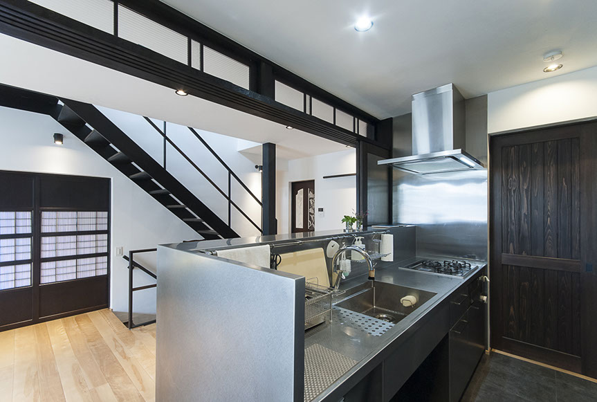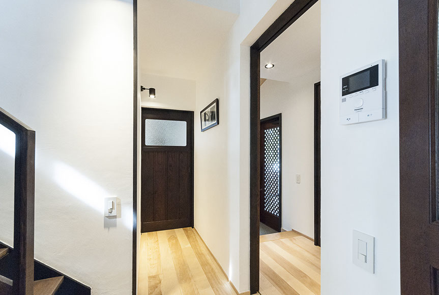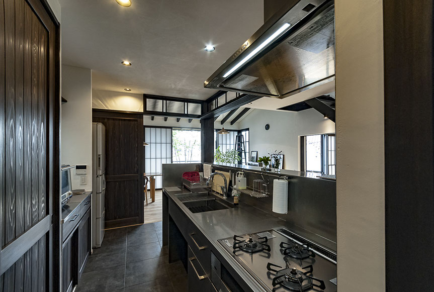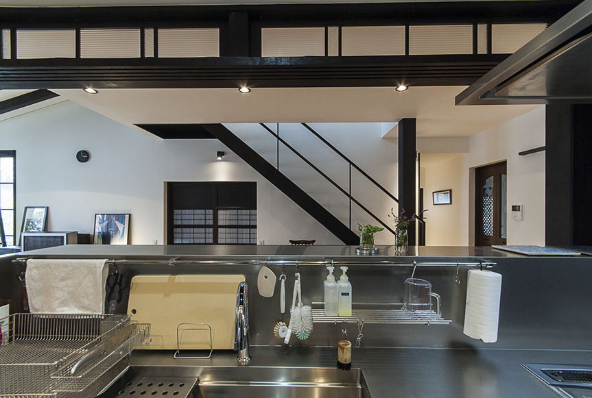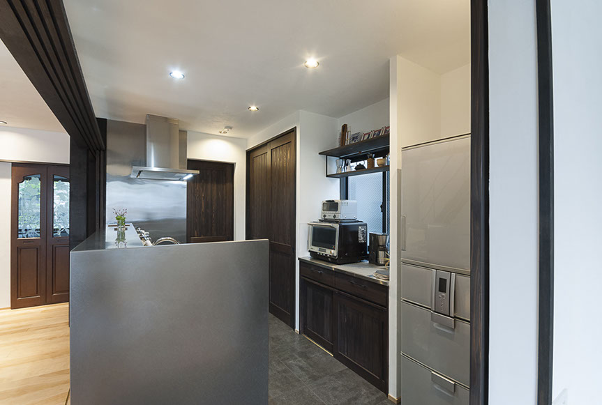おいしい空間は、使い勝手も良い空間です。キッチン内収納として、造付けの食器棚を配置。また、キッチンの横に納戸サイズの食品庫を設け、キッチン廻りの雑物だけでなく、掃除機なども収納する事が出来る様にしています。五感を満足させるおい